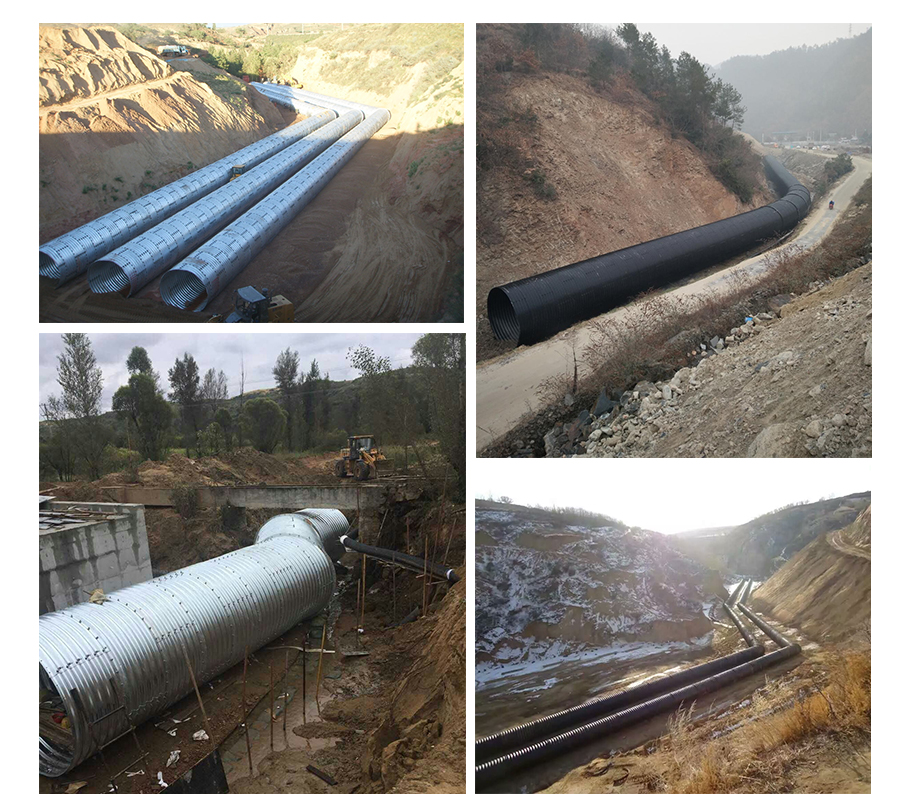 在山區(qū)雞爪大沖溝、市政彎曲河道等設(shè)置波紋鋼管排水涵時(shí),減少土方開(kāi)挖方量,在工廠預(yù)制波紋鋼彎頭進(jìn)行彎曲弧度處理,焊接150mm-250mm平法蘭,高強(qiáng)螺栓連接。